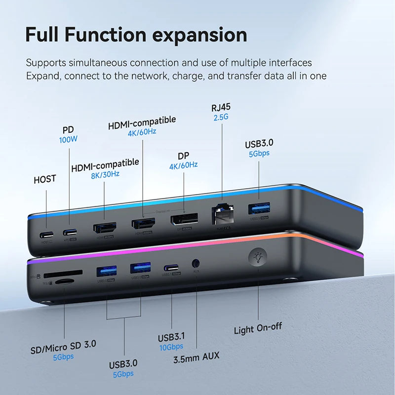 【13 in 1 Multi-functional expansion】This Hagibis docking station with 100W PowerDelivery port*1、8K@30Hz HDMI-compatible port*1、4K @60Hz HDMI-compatible port*1、 4K@60Hz DisplayPort port*1、2.5G Ethernet port*1、5Gbps USB 3.0 port*3、3.0 SD card reader*1、3.0 Micro SD card reader*1、10Gbps USB 3.1 port*1、3.5mm Aux port*1 and LED light Switch button,Meeting your various needs.