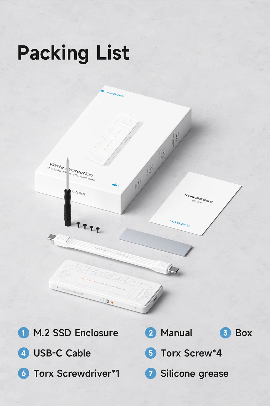 Wide Compatibility: Hagibis Write Protection M.2 enclosure compatible with M.2 PCIe3.0x4 NVMe M Key, NVMe B+M Key in sizes 2280/2260/2242/2230 up to 4TB, NOT compatible with M.2 SATA SSDs, M.2 PCIe AHCI SSDs, M.2 PCIe devices. Supports system multi OS, Windows, Mac OS, Linux, Android. Plug and play, no drive and power supply required