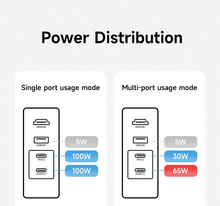 I am using it with port 1, supplying power via pd 85w while displaying qhd at 60hz over hdmi. Initially, it works fine, but after a few hours, the hdmi connection becomes unstable, repeatedly connecting and disconnecting. The device also gets quite hot and starts to emit a slight odor, which makes me concerned, so i have decided to stop using it.