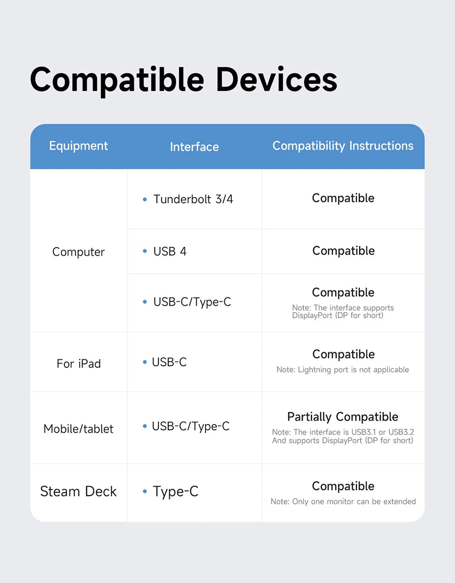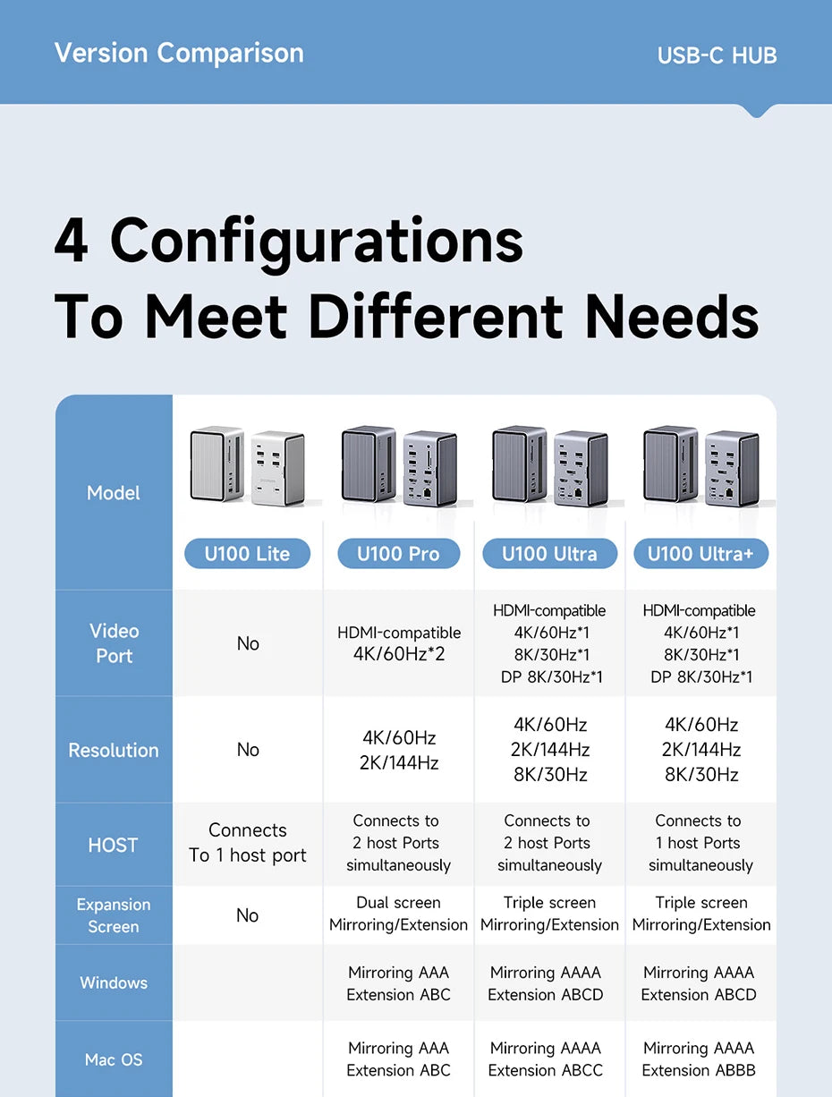 Note: There are 4 models of this product, U100 lite without any video interface; U100 with only one HDMI-compatible interface; U100 Pro with two HDMI-compatible interfaces; U100 Ultra with two HDMI-compatible interfaces and one DP interface; we have detailed descriptions in the color selection and description pictures, please check your choice when you buy!