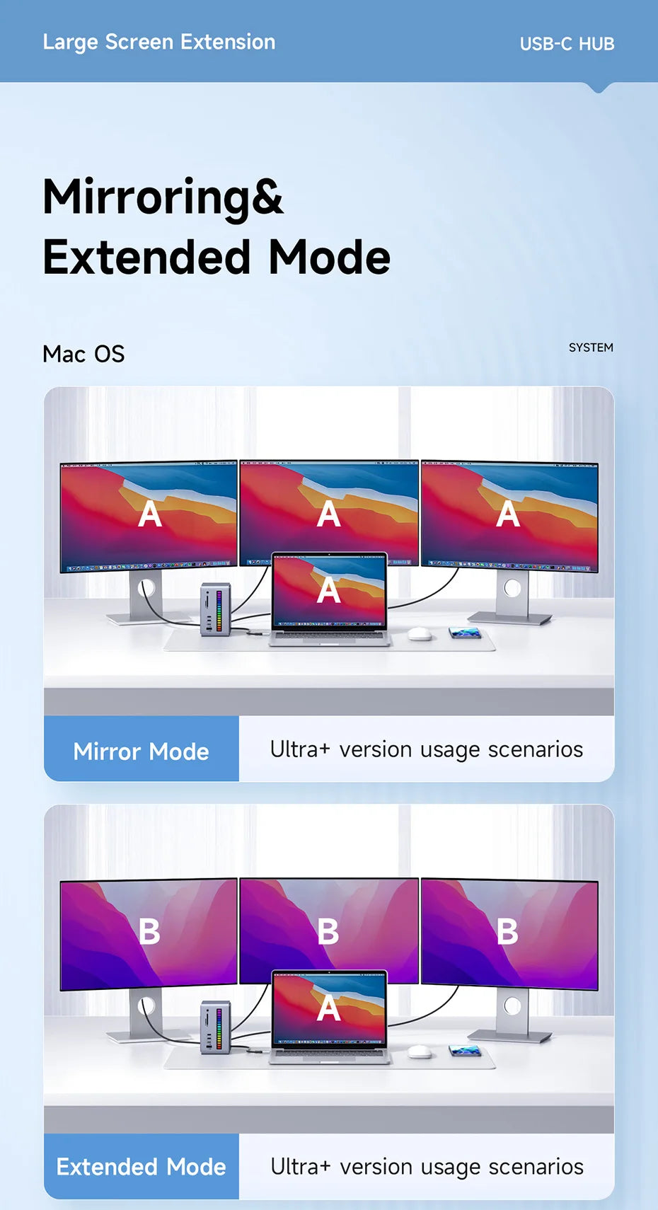 4K@60Hz Multi-Screen Entension: External 2 monitors at the same time, support Mirror Mode and Extended Mode. USB-C(A) is the main dock interface, can control all the interfaces except the right HDMI-compatible. USB-C(B) can only control the right HDMI-compatible interfce. *Tip: Apple M1 chip does not support Multi-Screen, can only expand to one external screen, but M1 Pro and M1 Max chips are not limited