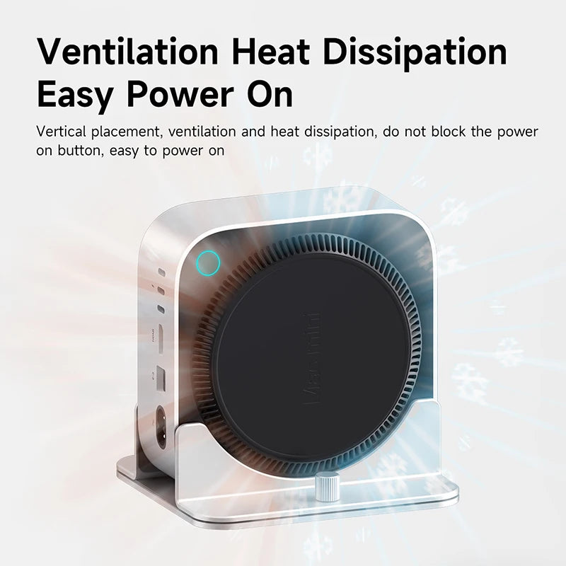 Alloy Material: The Mac Mini is placed on the vertical stand, and the desktop is clean and tidy. Both heat dissipation and beauty